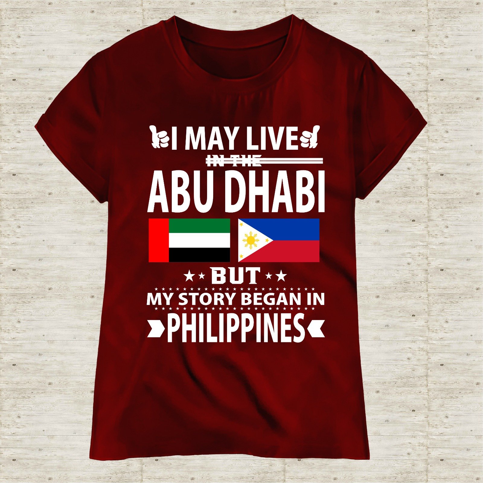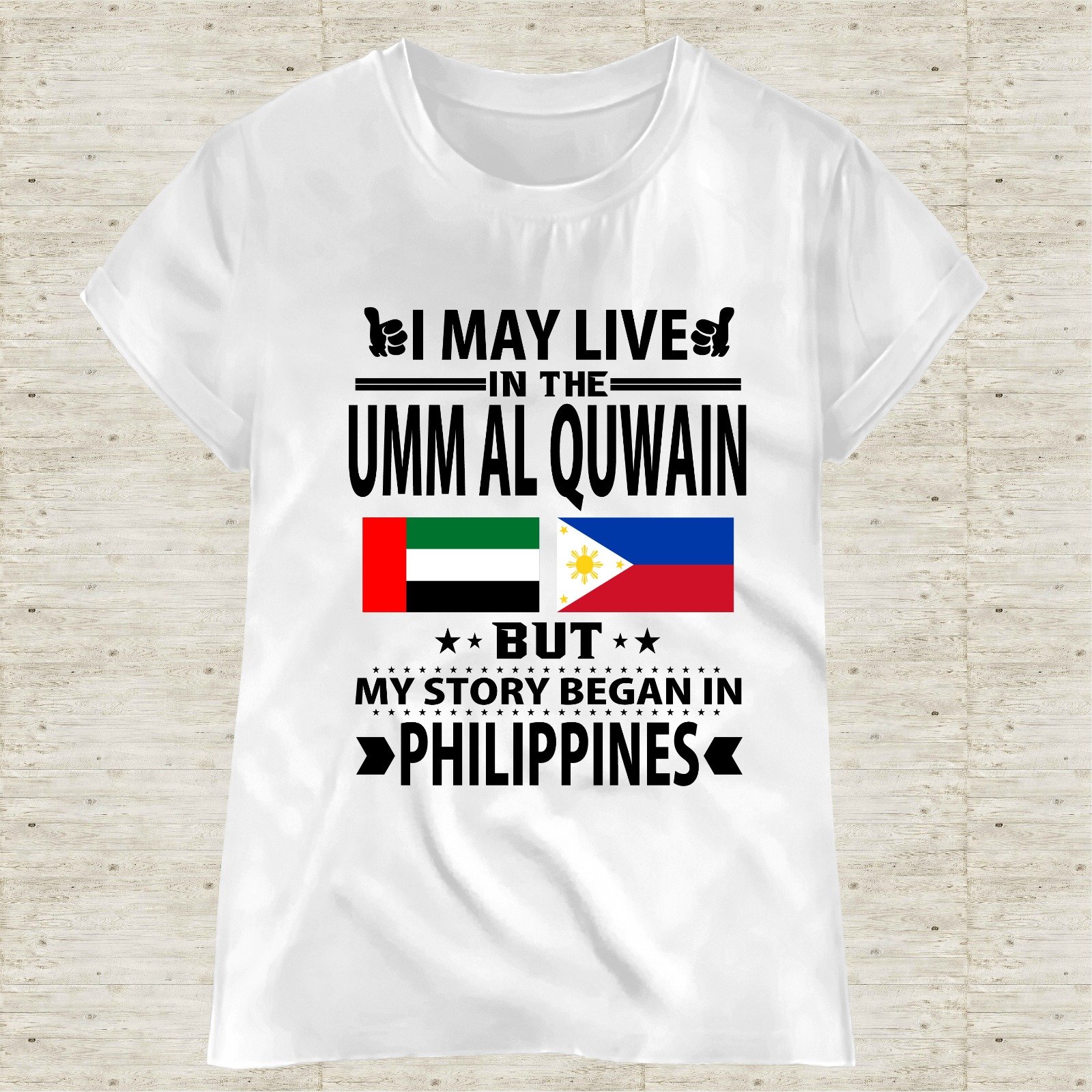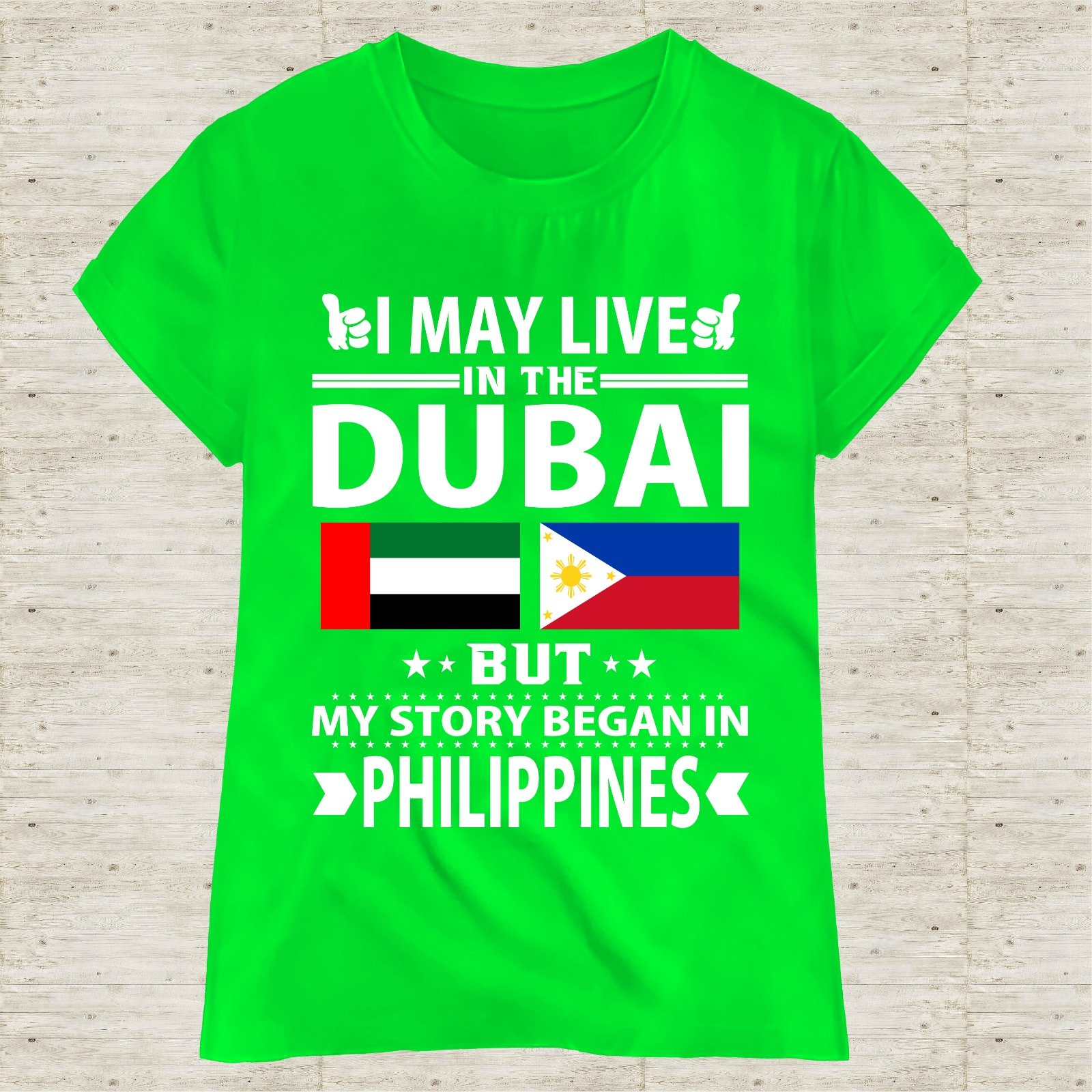 This “I May Live in Dubai But My Story Began in Philippines” T-shirt is designed for proud Filipinos living and working in the UAE. Featuring a bold typography layout with UAE and Philippine flags, this shirt represents identity, hard work, and pride.