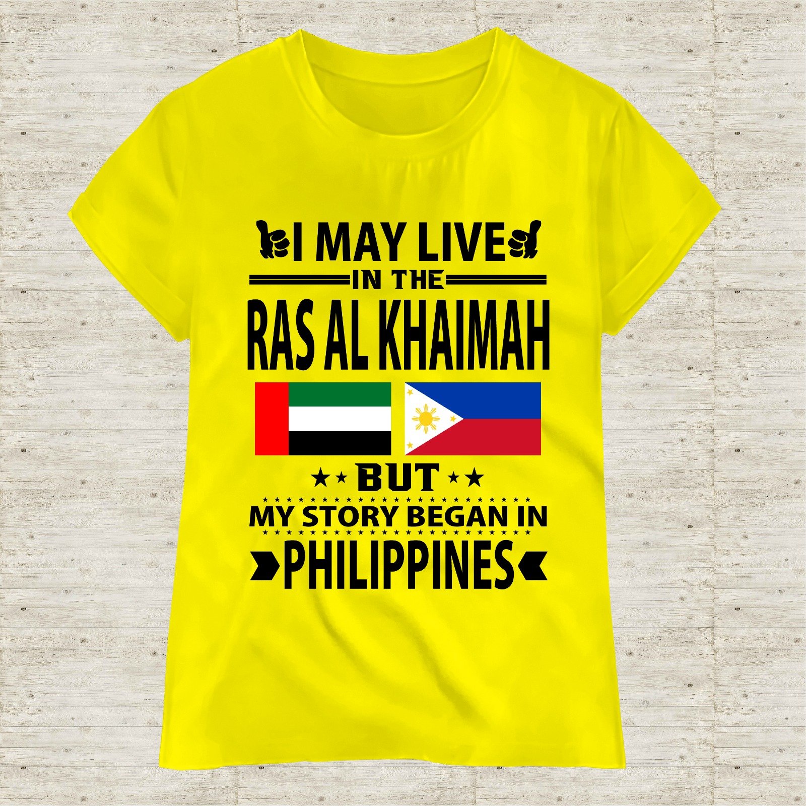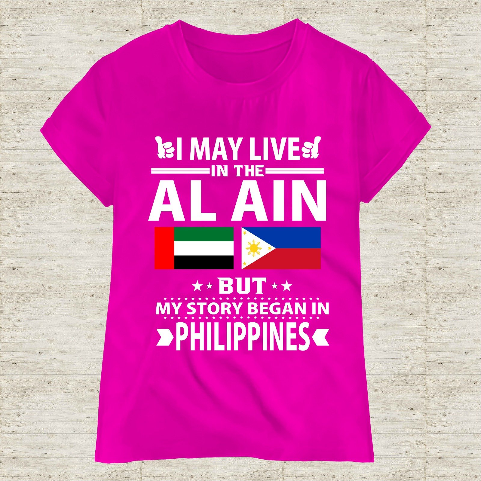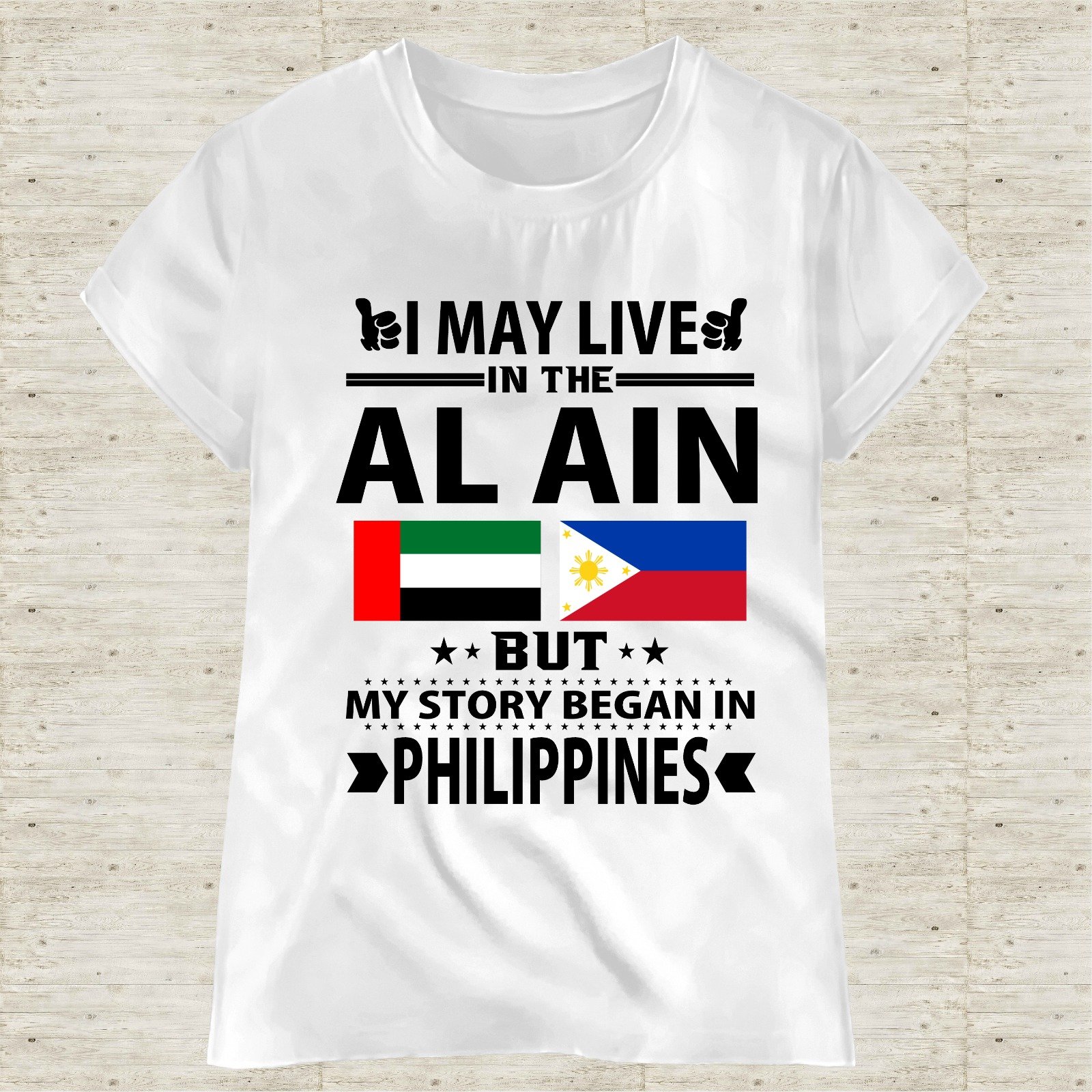 This “I May Live in Dubai But My Story Began in Philippines” T-shirt is designed for proud Filipinos living and working in the UAE. Featuring a bold typography layout with UAE and Philippine flags, this shirt represents identity, hard work, and pride.