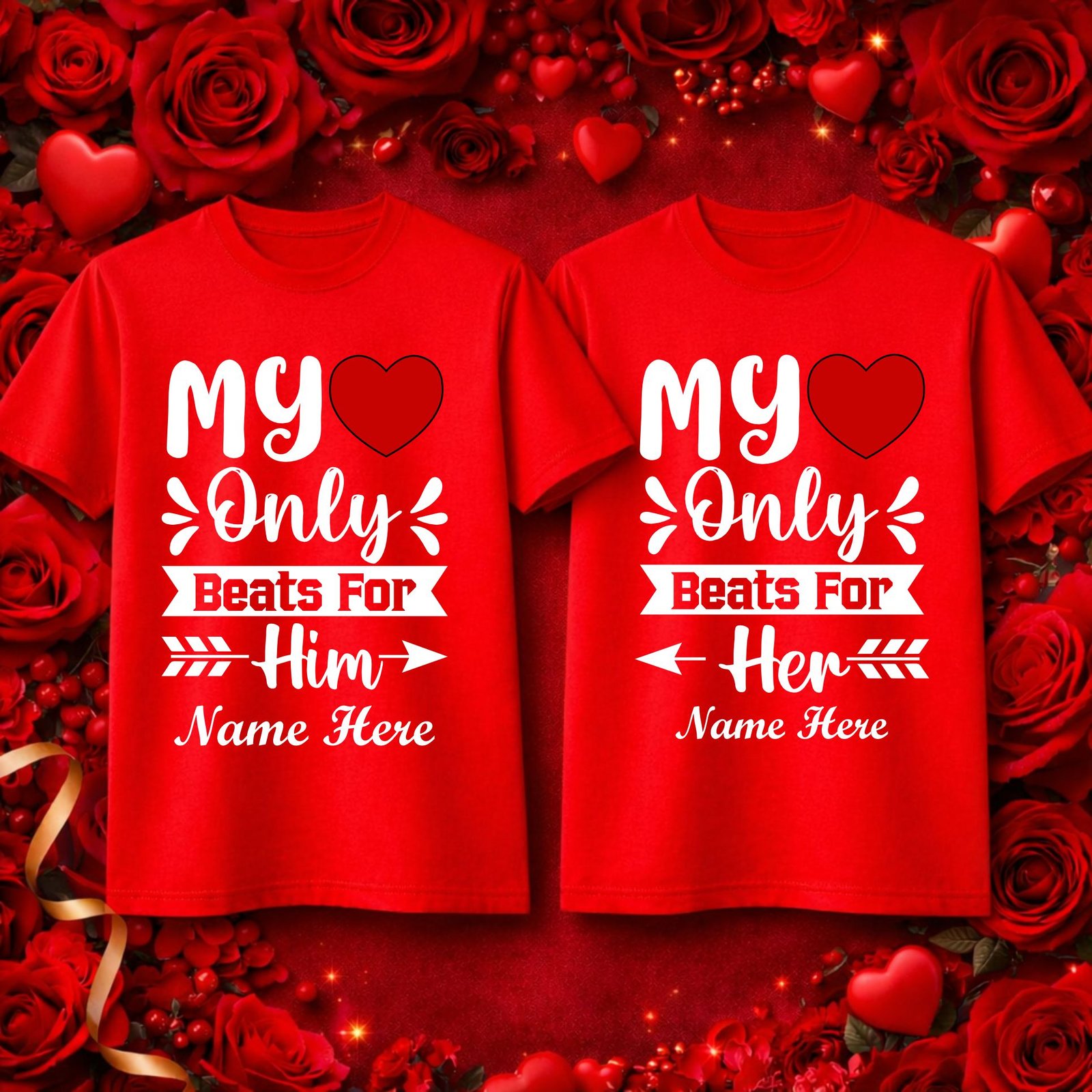 Show your love with these personalized Valentine couple T-shirts featuring “My Heart Beats Only for Him” and “My Heart Beats Only for Her”. Custom names included, perfect for romantic matching outfits.
